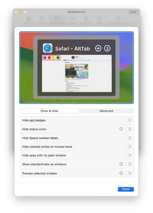 AltTab replaces the native Command + Tab behavior with a window-based switcher.